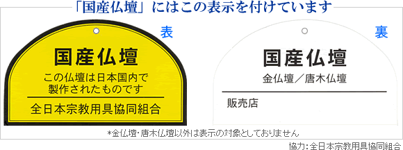 仏様・ご先祖をお祀りするところであるお仏壇。皆様はこのお仏壇に「国産品」と「輸入品」があるのをご存知でしたか?実は流通しているお仏壇の約半数が「輸入品」です。その上一般の方々ではこれら「国産品」と「輸入品」の見分けがつきにくいのが現状です。また「輸入品」の拡大により、伝統工芸品を含む「国産仏壇」の流通に多大な影響を及ぼしていることも事実です。全日本宗教用具協同組合(本部:東京)では消費者である皆様に対し、情報開示の一つとして「国産仏壇」を明示し、その上で国産仏壇の保護と普及を目的とする、「国産仏壇の統一表示事業」を実施しています。